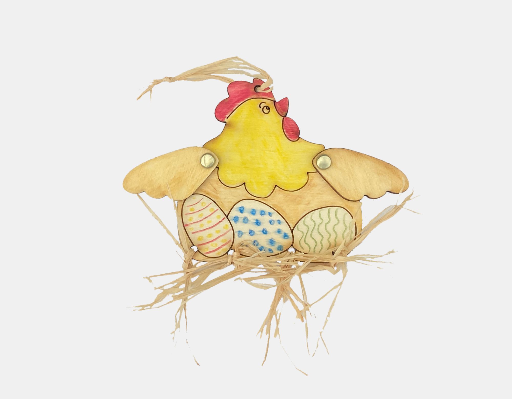 Dřevěné ozdoby ve tvaru slepičky na vejcích. Kreativní sada na výrobu velikonoční ozdoby.